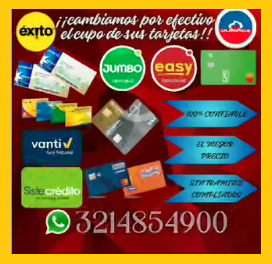 40 años nos hemos dedicado a ofrecer soluciones económicas, a través del cambio del cupo de tarjetas y sistemas de crédito por efectivo, cambio de bonos, en este tiempo hemos ayudado a cientos de personas, quienes se encontraban en una necesidad y requerían de una solución rápida y segura, nosotros pudimos tenderles la mano y sacarlos del apuro por lo tanto esperamos también poder servirle a usted. Nuestros servicios son: Dinero en efectivo por tarjeta de crédito utilizando el cupo para compras de: